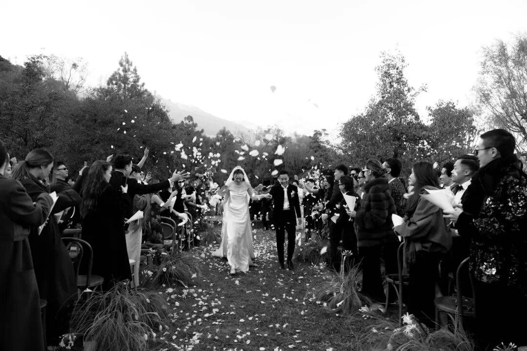 此次婚礼的现场部署同样极尽遏抑又相当高级。从典礼枢纽,就没有堆砌过众的红毯、水晶灯、鲜花拱门,而是主打一个“原生感”,自然即是最好的舞台。