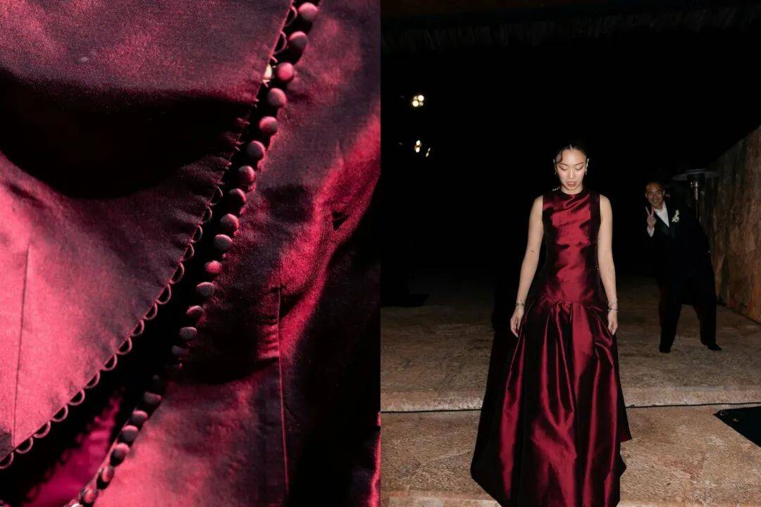 晚宴时间,Namfon换上一袭赤色缎面长裙。缎面材质自带光泽感,配合修身剪裁,性感娇媚,像一杯醇厚的红酒。
