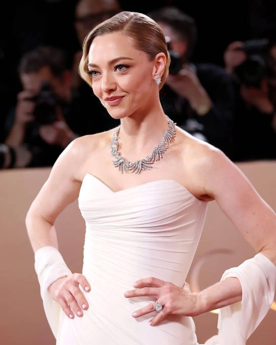 行动本场的“毯霸”——一语气揽下两项提名的阿曼达(Amanda Seyfried),极简素净优美的抹胸礼裙由蒂芙尼高珠为其装饰。这件镶嵌着横跨 89 克拉钻石的项链打算灵感来自得海上潋滟的虹光,衬得她随便就美成了维纳斯。
